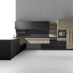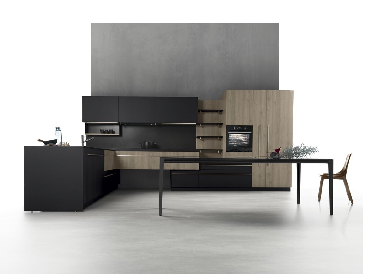 Research for new materic finishes, but at the same time soft and elegant, combined with the study of functional volumes, contribute in creation of the first environment dedicated to model skin. The parts in bilaminated black soft touch and Oak neck, are joined to creating an incomparable demarcation of technical areas and a beautiful play of volumes. The kitchen is no longer a place devoted to preparing food, but a convivial place, where people can share together the pleasure of life. The wall is designed as a place of containment of all technical elements, while the island is used as a work area and snack.